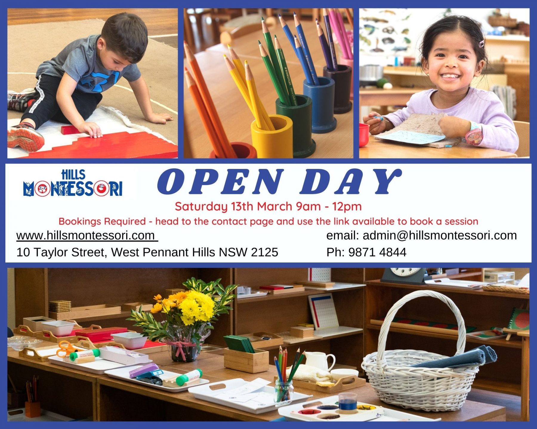 Please join us for our upcoming Open Day on Saturday 13th March 2021 from 9am to 12pm. On the day you can explore the class rooms, speak to the educators and parents of current children. This year you will need to book into a session for Open Day and the link to do this can be found on the Contact page of our website.