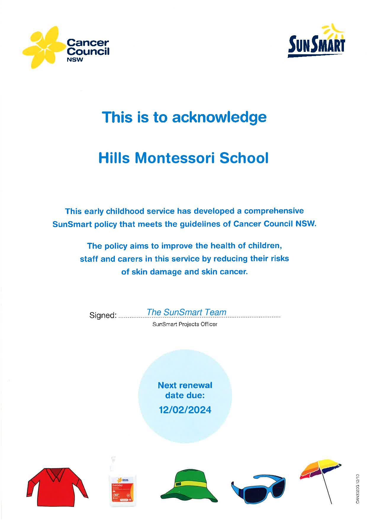Hills Montessori is pleased to be recognised as a Sun Smart Preschool